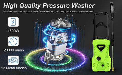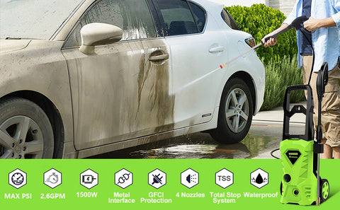 The Homdox electric pressure washer generates up to MAX PSI of water pressure and 2.6 GPM of water flow for maximum cleaning power.