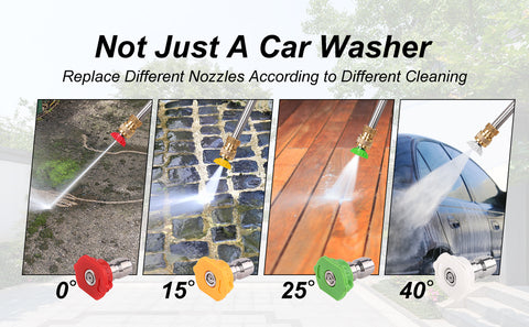 ✓ 5 NOZZLES OPTIONS - 5 Quick-Connect spray tips (0º, 15º, 25º, 40º, 60º and soap) tackle light,medium and heavy duty cleaning tasks.0º - areas that are high and hard to reach; clean crevices in sidewalks or driveways; 15º- use on concrete, brick and other hard surfaces with stubborn stains; 25º- use on painted surfaces, wood siding, fences and lawn mowers;40º- use on windows and screens;60º- use on car, patios, garden ,furniture and more;soap- use to spray soaps and detergents