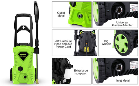 ✓Humanized Design&Customer Support:Energy conservation, environment friendly, quieter than gas engine pressure washer.The high-pressure washer has 2 sturdy wheels and ergonomic telescopic rods; the hook is used to store wires, guns and soap bottles; it is very convenient to use.We provide a 2 year warranty, if you have any problems with your high pressure cleaner, you can contact us at any time. If you are not satisfied, you can get a full refund within 30 days! !